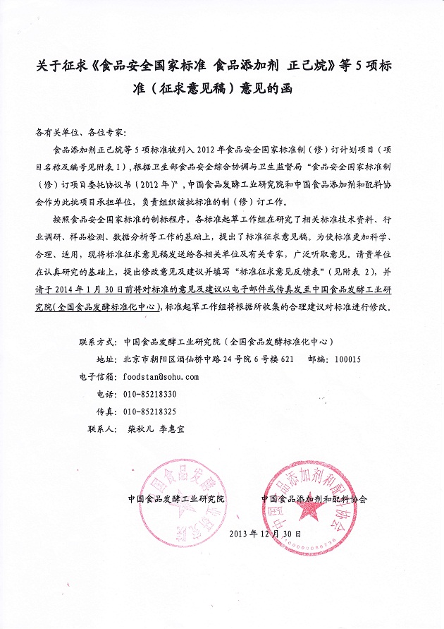 食品添加劑正己炕等5項標準被列入2012年食品安全國家標準制(修)訂計劃項目(項目名稱及編號見附表1),根據衛生部食品安全綜合協調與衛生監督局“食品安全國家標準制(修)訂項目委托協議書(2012年)”,中菌食品發酵工業研究院和中國食品添加劑和配料協會作為此批項目承擔單位,負責組織該批標準的制(修)訂工作。