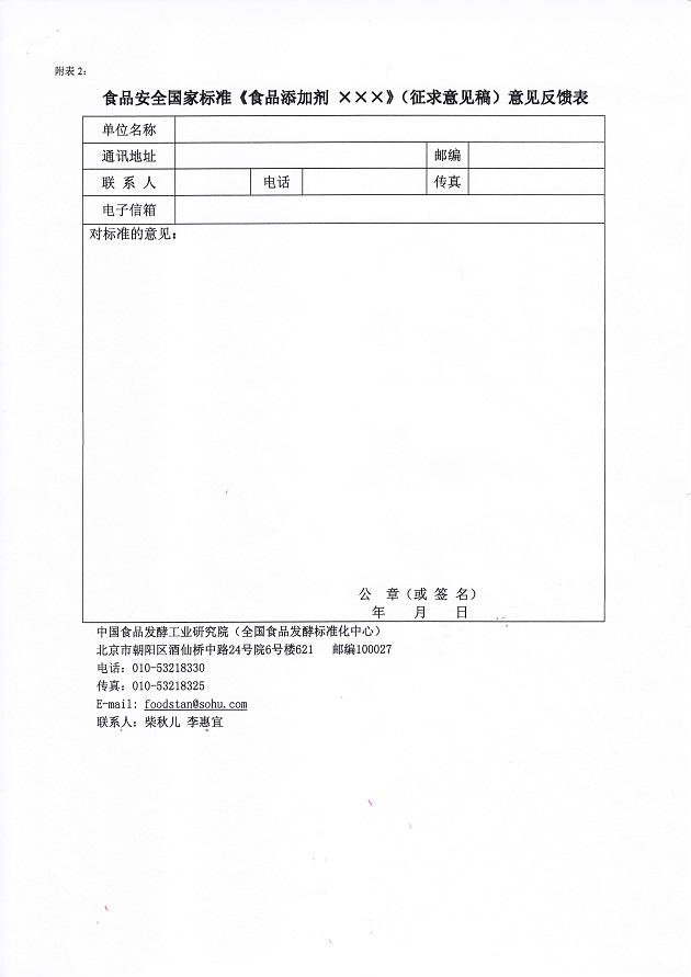 按照食品安全國家標準的制標程序,各標準起草工作組在研究了相關標準技術資料、行業調研 、樣品檢測 、數據分析等工作的基礎上 ,提出了標準征求意見稿。為使標準更加科學、合理、適用,現將標準征求意見稿發送給各相關單位及有關專家,廣泛聽取意見。請貴單位在認真研究的基礎上,提出修改意見及建議并填寫“標準征求意見反饋表”(見附表2),并請于2014年1月30日前將對標準的意見及建議以電子郵件或傳真發至中國食品發酵工業研究院(全國食品發酵標準化中心),標準起草工作組將根據所收集的合理建議對標準進行修改。