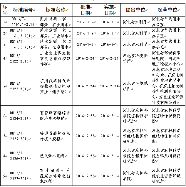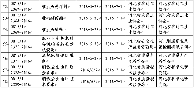 2016年1月以來,河北省質(zhì)量技術(shù)監(jiān)督局批準(zhǔn)發(fā)布了《工業(yè)企業(yè)揮發(fā)性有機(jī)物排放控制標(biāo)準(zhǔn)》等58項河北省地方標(biāo)準(zhǔn),現(xiàn)予以公告。