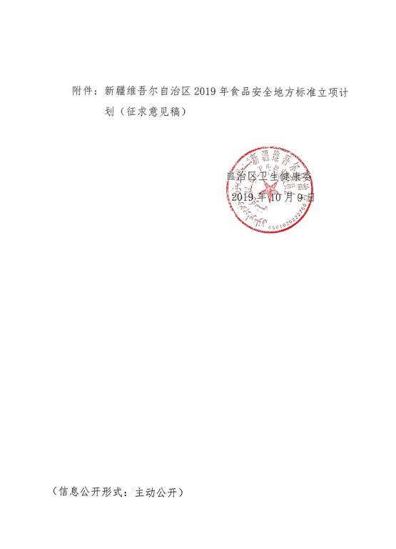 新疆維吾爾自治區衛生健康委員會關于公開征求新疆維吾爾自治區2019年食品安全地方標準立項計劃(征求意見稿)意見的函