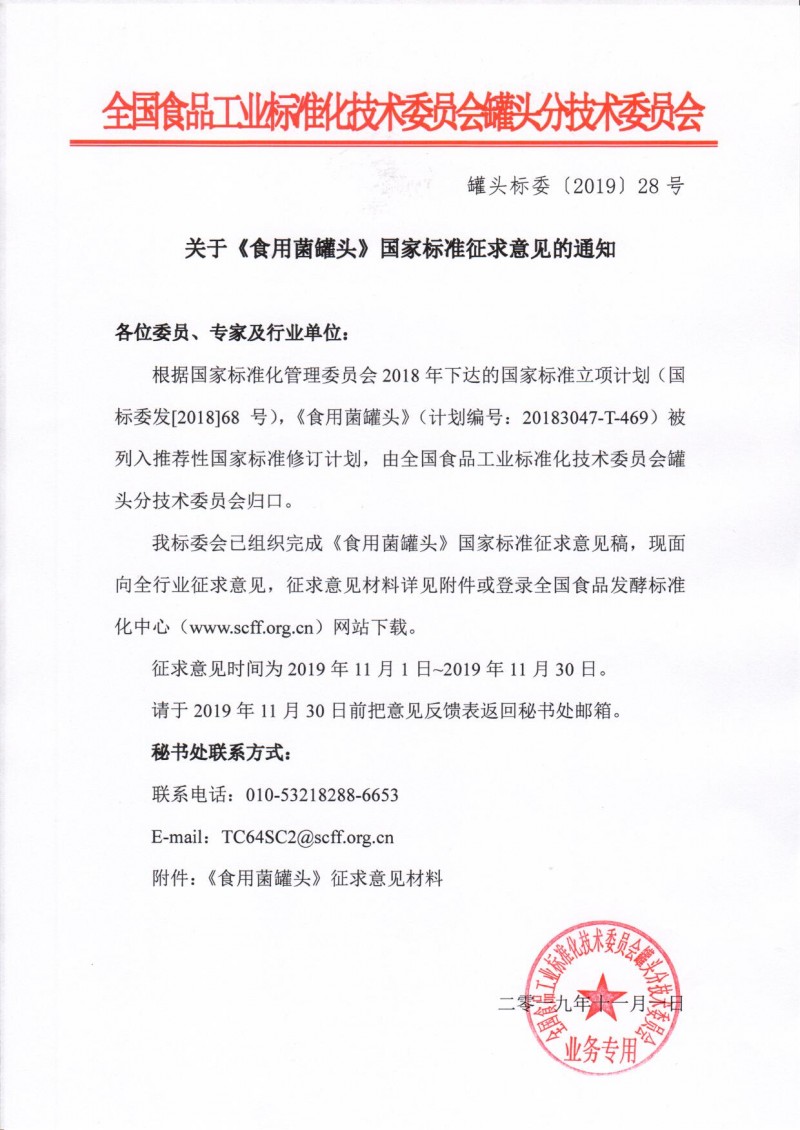 全國食品工業標準化技術委員會關于《食用菌罐頭》國家標準征求意見的通知(罐頭標委(2019) 28號)