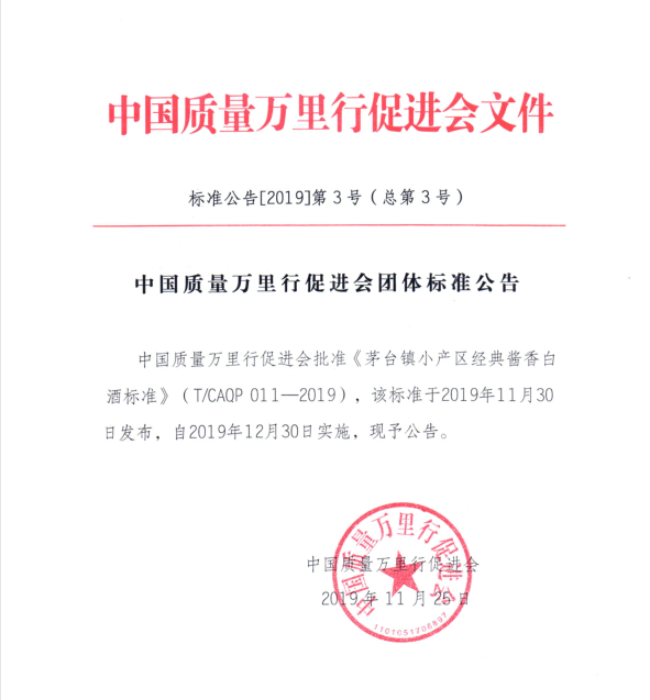 核心提示:中國質量萬里行促進會關于《茅臺鎮小產區經典醬香白酒標準》、《高品質蜂蜜》兩項團體標準發布的公告(標準公告[2019]第3號)。