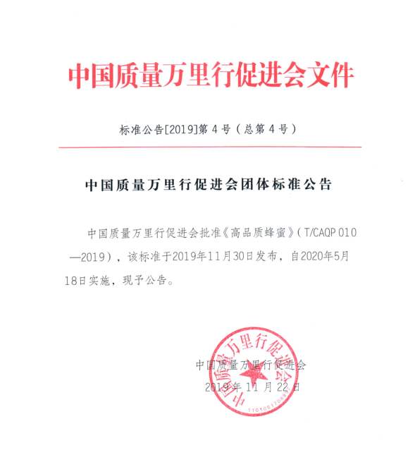 中國質量萬里行促進會關于《茅臺鎮小產區經典醬香白酒標準》、《高品質蜂蜜》兩項團體標準發布的公告