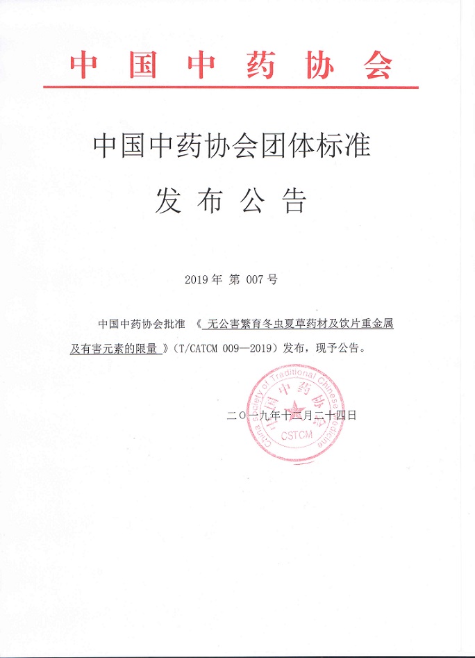 《無公害繁育冬蟲夏草藥材及飲片重金屬及有害元素的限量》(T/CATCM 009—2019)