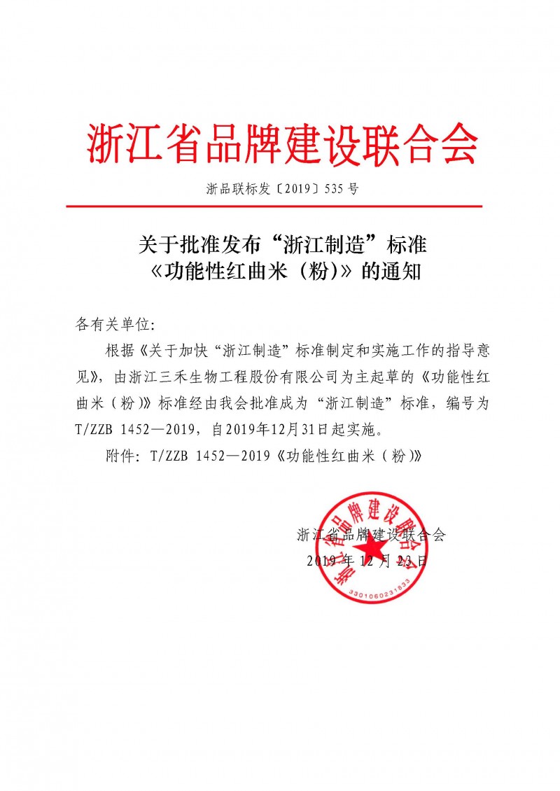 浙江省品牌建設聯合會關于批準發布“浙江制造”標準《功能性紅曲米(粉)》的通知(浙品聯標發〔2019〕535號)