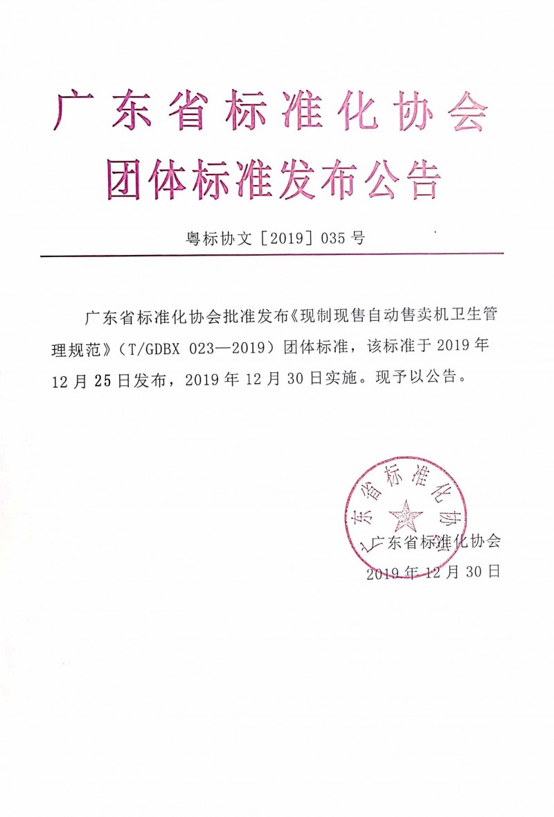 關于廣東省標準化協(xié)會批準發(fā)布《現制現售自動售賣機衛(wèi)生管理規(guī)范》團體標準的公告(粵標協(xié)文[2019]035號)