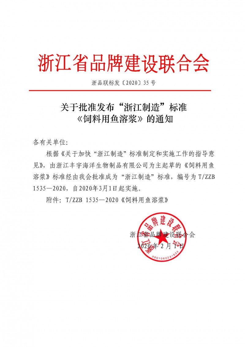 浙江省品牌建設聯合會關于批準發布“浙江制造”標準《飼料用魚溶漿》的通知(浙品聯標發〔2020〕035號)