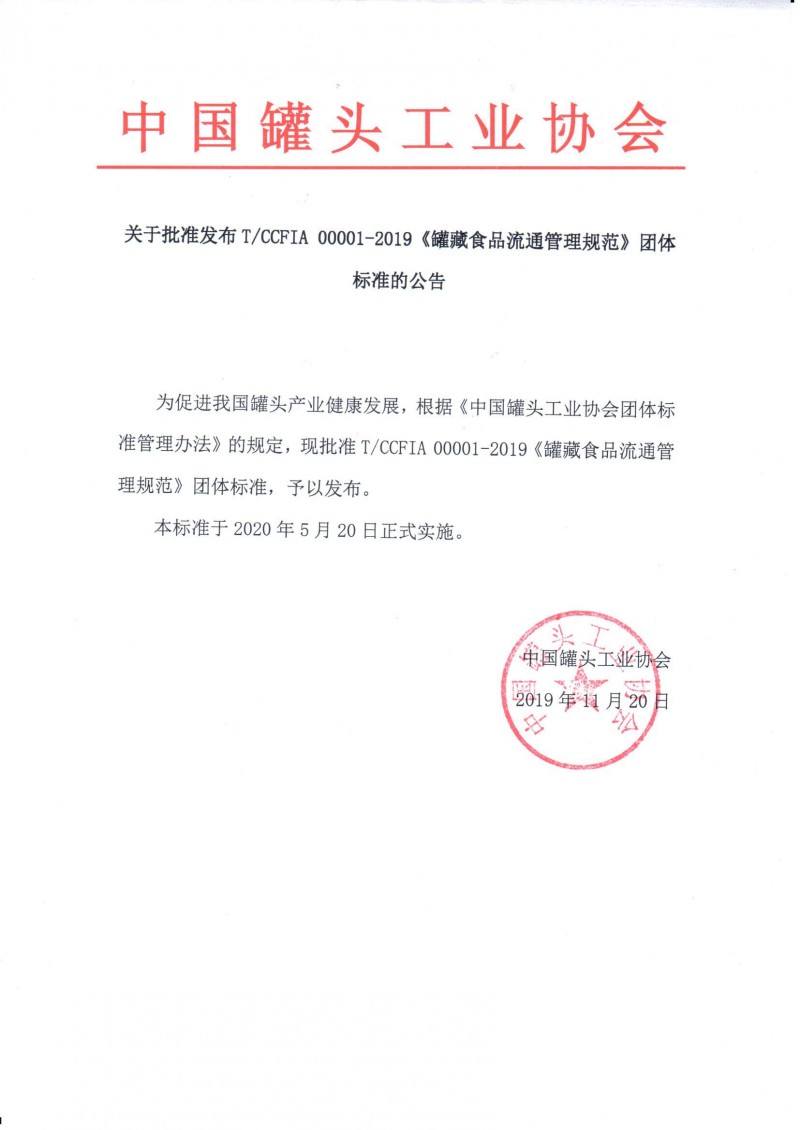 中國罐頭工業(yè)協(xié)會關于批準發(fā)布T/CCFIA 00001-2019《罐藏食品流通管理規(guī)范》團體標準的公告