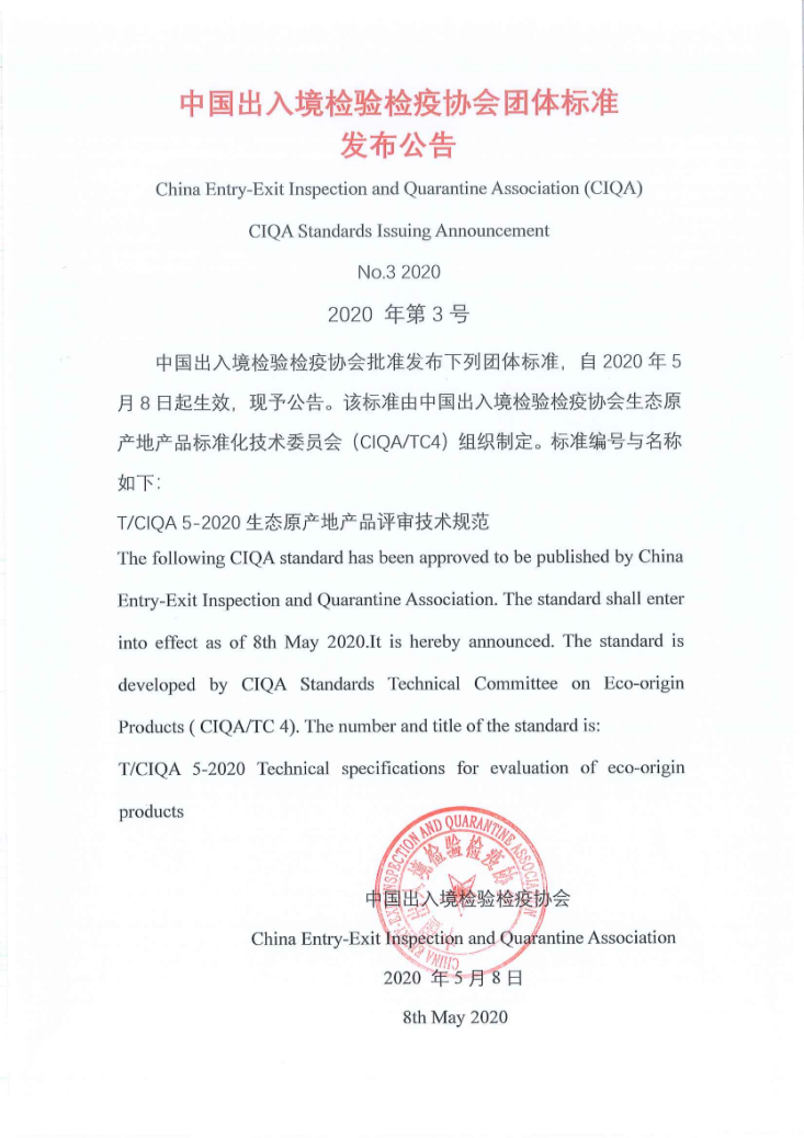 中國出入境檢驗檢疫協會團體標準發布公告《生態原產地產品評審技術規范》(2020年 第3號)
