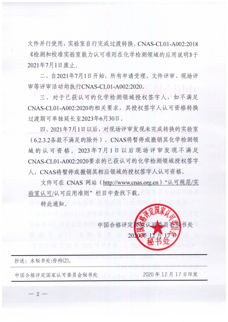 中國合格評定國家認可委員會關于CNAS-CL01-A002 化學應用說明修訂發布通知(認可委(秘)〔2020〕78號)