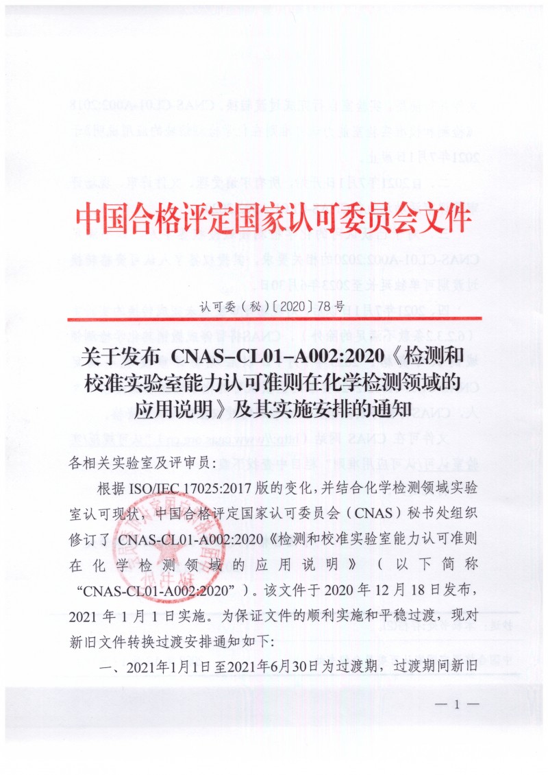 核心提示:中國合格評定國家認可委員會關于CNAS-CL01-A002 化學應用說明修訂發布通知(認可委(秘)〔2020〕78號),CNAS-CL01-A002-2018于2021-07-01廢止。