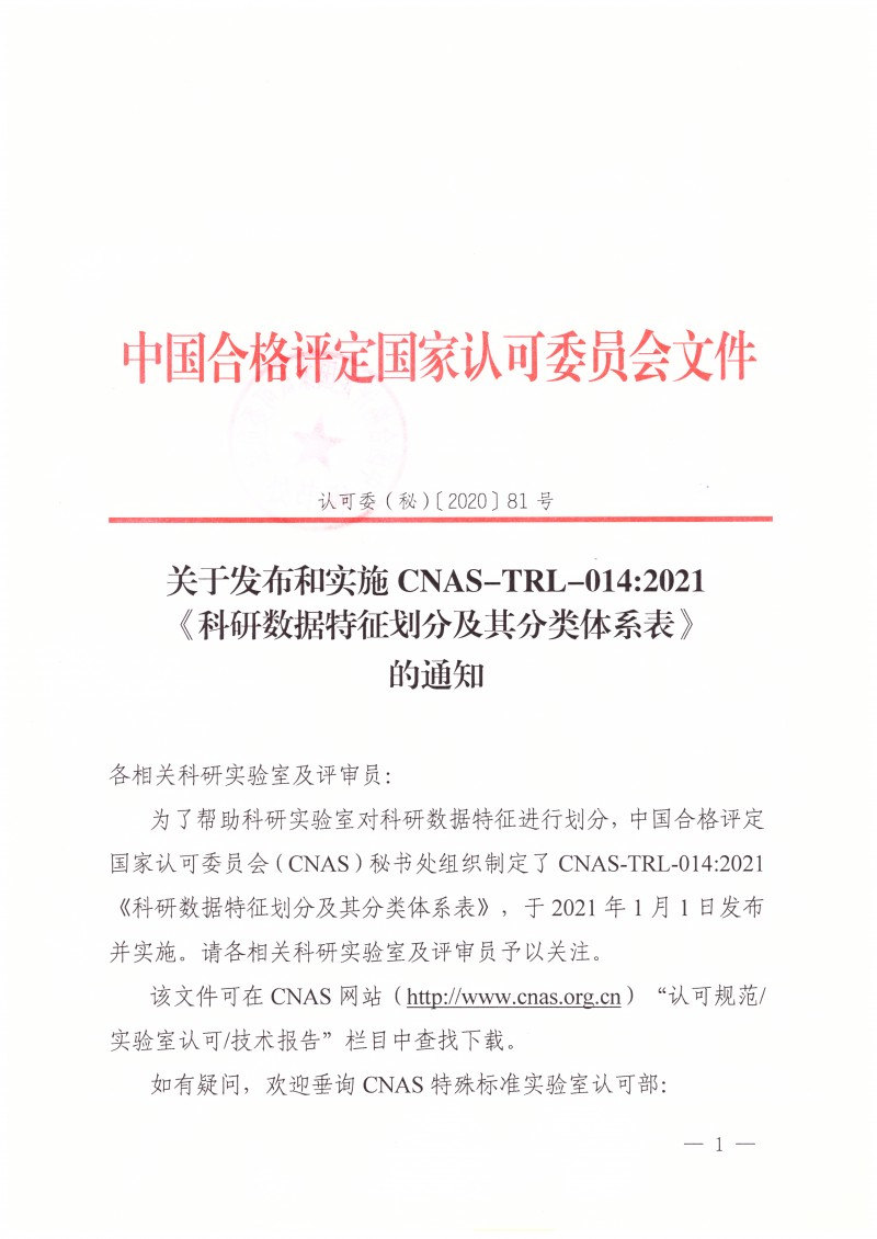 中國合格評定國家認可委員會關于發布和實施CNAS-TRL-014:2021《科研數據特征劃分及其分類體系表》通知(認可委(秘)〔2020〕81號)