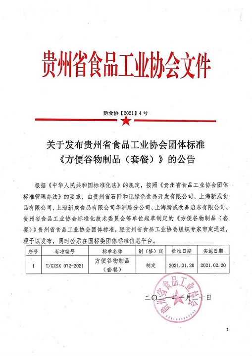 1 | T/GZSX 072-2020 | 方便谷物制品(套餐) | 制定 | 2021.01.20 | 2021.02.20 |