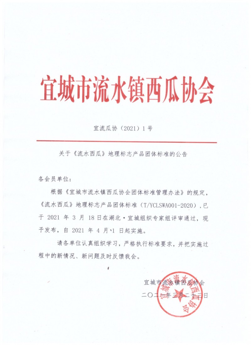 根據《宜城市流水鎮西瓜協會團體標準管理辦法》的規定,《流水西瓜》地理標志產品團體標準(T/YCLSWA001-2020),已于2021年3月18日在湖北·宜城組織專家組評審通過,現予發布,自2021年4月1日起實施。
