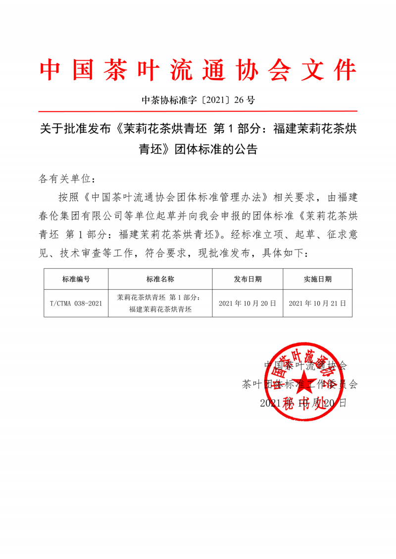 中國茶葉流通協會關于批準發布《茉莉花茶烘青坯 第1部分:福建茉莉花茶烘青坯》團體標準的公告(中茶協標準字〔2021〕26號)