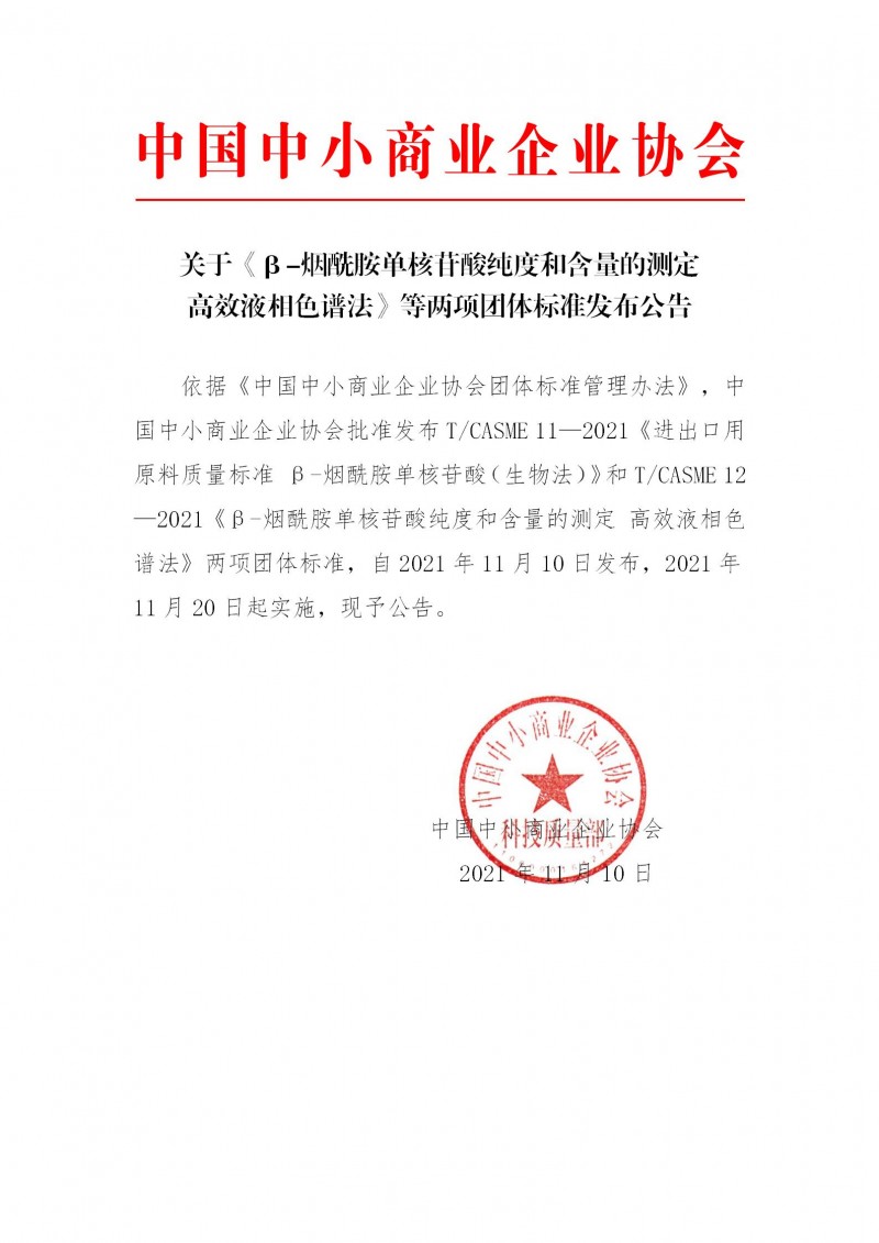 依據《中國中小商業企業協會團體標準管理辦法》,中國中小商業企業協會批準發布T/CASME 11—2021《進出口用原料質量標準 β-煙酰胺單核苷酸(生物法)》和T/CASME 12—2021《β-煙酰胺單核苷酸純度和含量的測定 高效液相色譜法》兩項團體標準,自2021年11月10日發布,2021年11月20日起實施,現予公告。