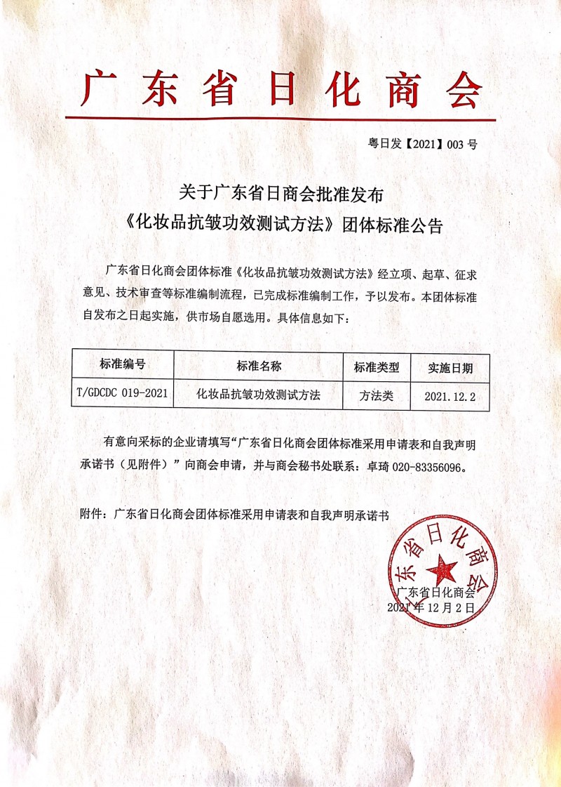 | T/GDCDC 019-2021 | 化妝品抗皺功效測試方法 | 方法類 | 2021.12.2 |