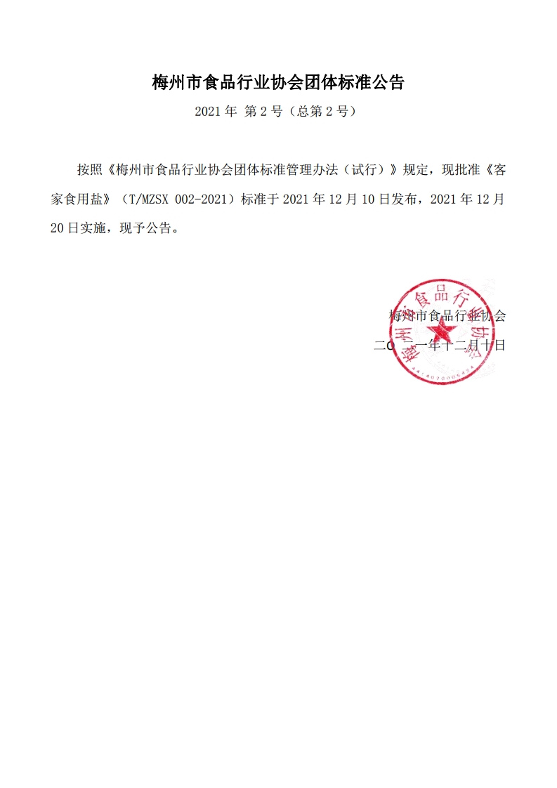 梅州市食品行業協會《客家食用鹽》團體標準公告(2021年第2號(總第2號))