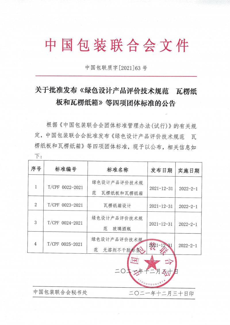 T/CPF 0022-2021 | 綠色設計產品評價技術規范 瓦楞紙板和瓦楞紙箱 | 2021-12-31 | 2022-02-01 |