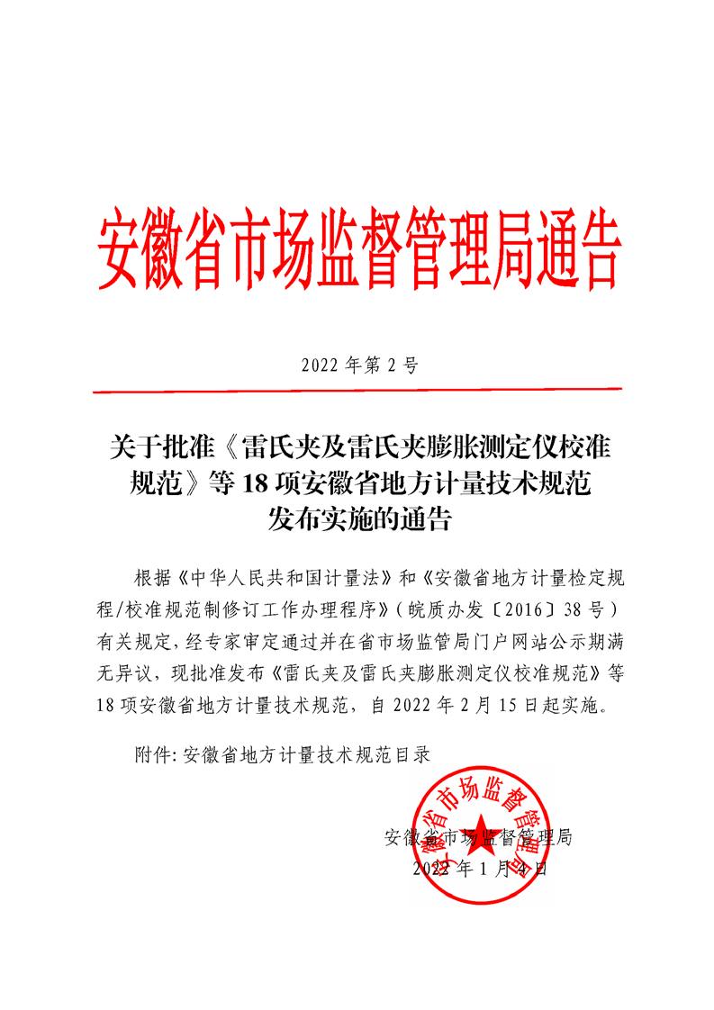 下載中心首頁 » 動態公告 » 標準公告 » 安徽省市場監督管理局關于批準《全自動凱氏定氮儀校準規范》等18項安徽省地方計量技術規范發布實施的通告(2022年第2號)