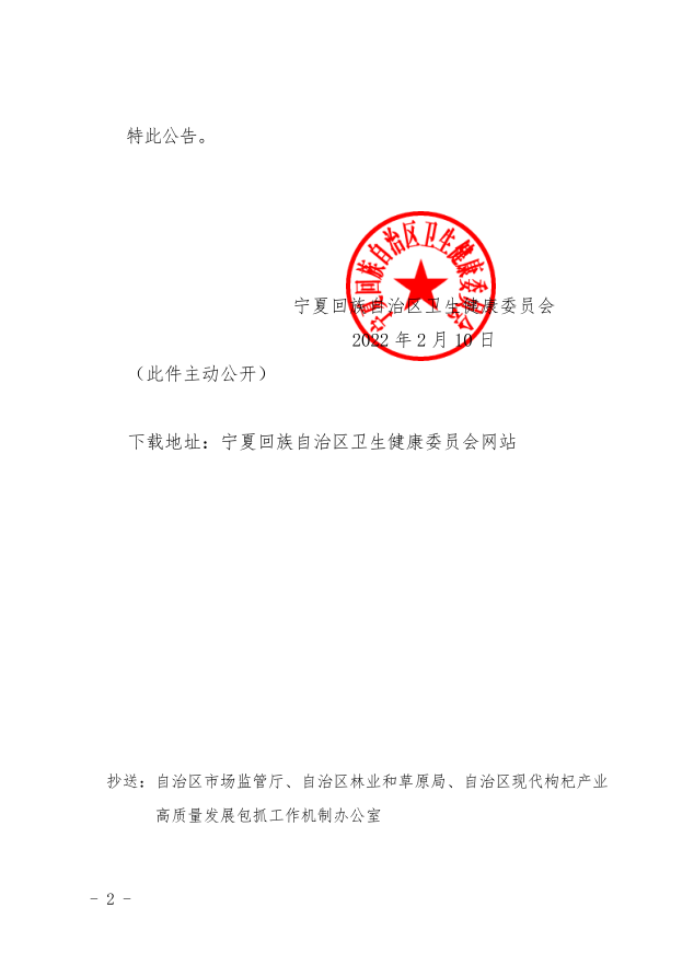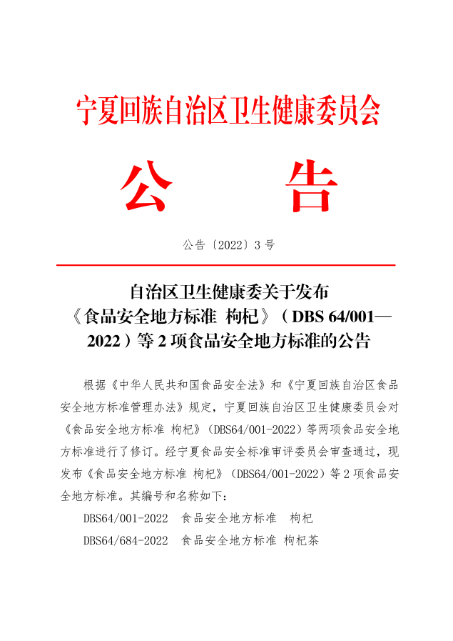 下載中心首頁 » 動態公告 » 標準公告 » 寧夏回族自治區衛生健康委關于發布《食品安全地方標準 枸杞》(DBS 64/001——2022)等2項食品安全地方標準的公告(公告〔2022〕3號)