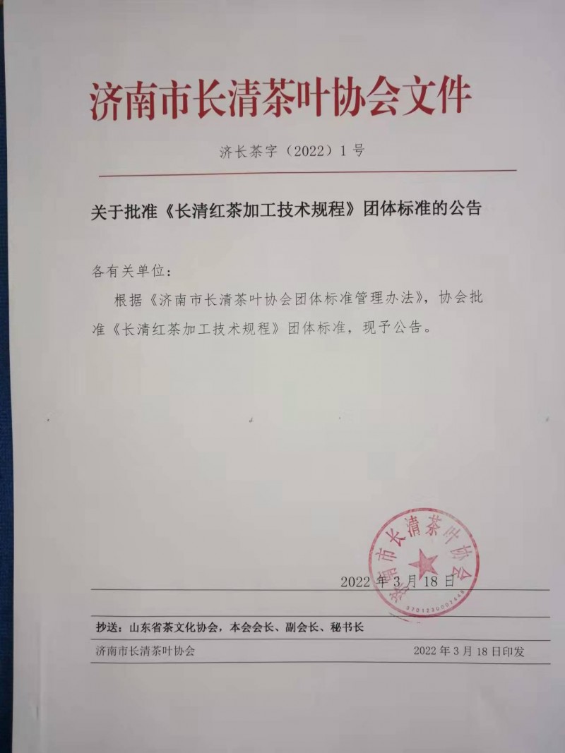 2022年3月18日,濟(jì)南市長(zhǎng)清茶葉協(xié)會(huì)會(huì)長(zhǎng)辦公會(huì)研究確定,根據(jù)《濟(jì)南市長(zhǎng)清茶葉協(xié)會(huì)團(tuán)體標(biāo)準(zhǔn)管理辦法》,批準(zhǔn)《長(zhǎng)清紅茶加工技術(shù)規(guī)程》團(tuán)體標(biāo)準(zhǔn),準(zhǔn)予發(fā)布。
