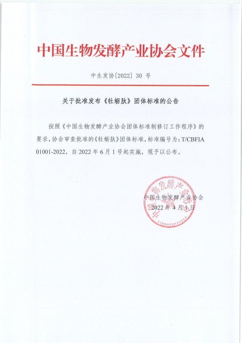 中國生物發酵產業協會關于批準發布《牡蠣肽》團體標準的公告