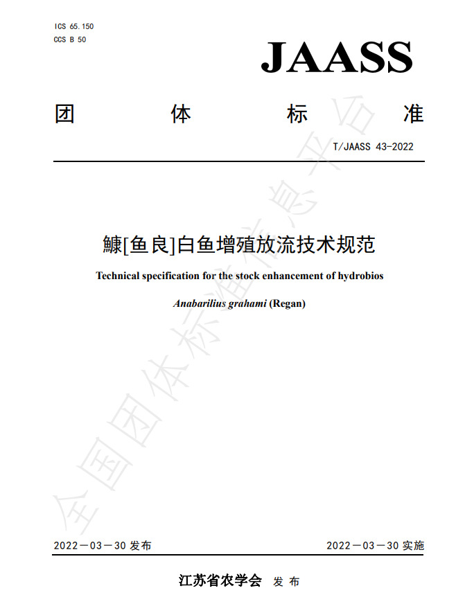 2022年3月30日,江蘇省農(nóng)學(xué)會團體標(biāo)準(zhǔn)《鱇[魚良]白魚增殖放流技術(shù)規(guī)范》正式發(fā)布,標(biāo)準(zhǔn)編號為“T/JAASS 43-2022”。該標(biāo)準(zhǔn)是國家重點研發(fā)計劃“藍色糧倉科技創(chuàng)新”重點專項“高原湖泊漁業(yè)資源與生物多樣性保護模式示范”的重要產(chǎn)出成果之一,由中國科學(xué)院南京地理與湖泊研究所作為牽頭單位,玉溪市撫仙湖管理局、云南茂灣水產(chǎn)養(yǎng)殖有限責(zé)任公司作為參與單位共同編制。