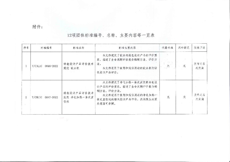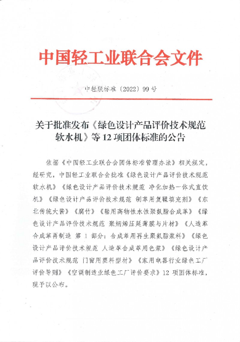 中國輕工業聯合會關于批準發布《綠色設計產品評價技術規范 軟水機》等12項團體標準的公告(中輕聯標準[2022]99號)