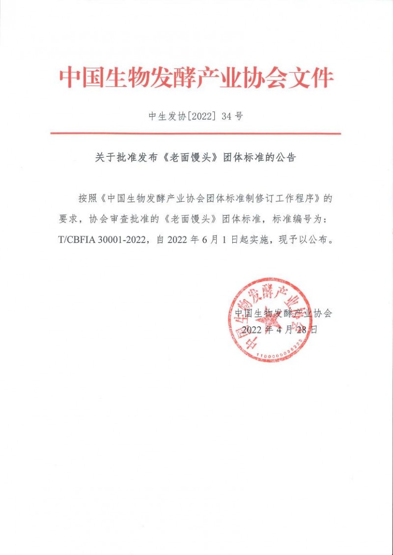 中國生物發酵產業協會 關于批準發布《老面饅頭》團體標準的公告(中生發協[2022]34號)