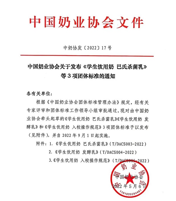 中國奶業協會關于發布《學生飲用奶 巴氏殺菌乳》等3項團體標準的通知(中奶協發[2022]17號)