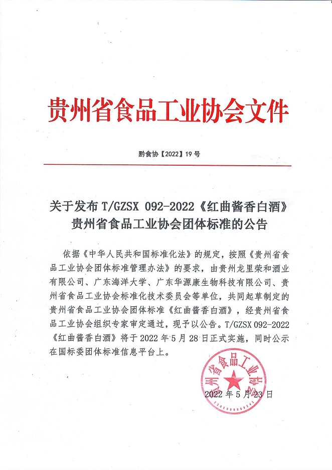 依據(jù)《中華人民共和國標準化法》的規(guī)定,按照《貴州省食品工業(yè)協(xié)會團體標準管理辦法》的要求,由貴州龍里榮和酒業(yè)有限公司、廣東海洋大學(xué)、廣東華源康生物科技有限公司、貴州省食品工業(yè)協(xié)會標準化技術(shù)委員會等單位,共同起草制定的貴州省食品工業(yè)協(xié)會團體標準《紅曲醬香白酒》,經(jīng)貴州省食品工業(yè)協(xié)會組織專家審定通過,現(xiàn)予以公告。T/GZSX 092-2022《紅曲醬香白酒》將于2022年5月28日正式實施,同時公示在國標委團體標準信息平臺上。