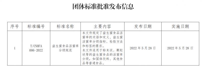 根據《中華人民共和國標準化法》以及國家標準化管理委員會、民政部《團體標準管理規定》相關要求,經中國營養保健食品協會標準管理委員會審核通過,批準發布《益生菌食品活菌率分級規范》團體標準(標準編號、名稱、主要內容等見附件),自2022年5月28日起實施。