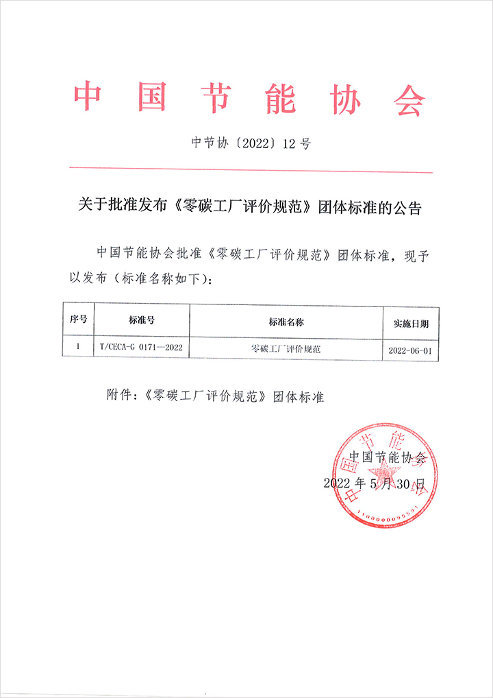 中國節(jié)能協(xié)會關(guān)于批準(zhǔn)發(fā)布《零碳工廠評價(jià)規(guī)范》團(tuán)體標(biāo)準(zhǔn)的公告