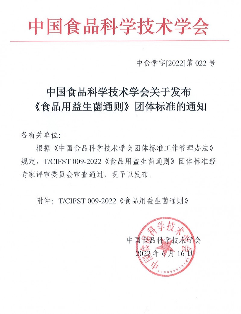 中國食品科學技術學會關于發布《食品用益生菌通則》團體標準的通知(中食學字[2022]第022號)