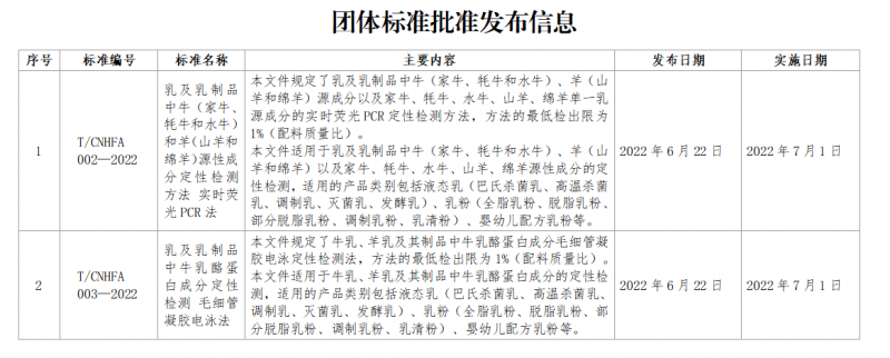 中國營養保健食品協會批準發布《乳及乳制品中牛(家牛、牦牛和水牛)和羊(山羊和綿羊)源性成分定性檢測方法 實時熒光PCR法》(T/CNHFA 002-2022)團體標準和《乳及乳制品中牛乳酪蛋白成分定性檢測 毛細管凝膠電泳法》(T/CNHFA 003-2022)團體標準,現予公告,自2022年7月1日起實施。