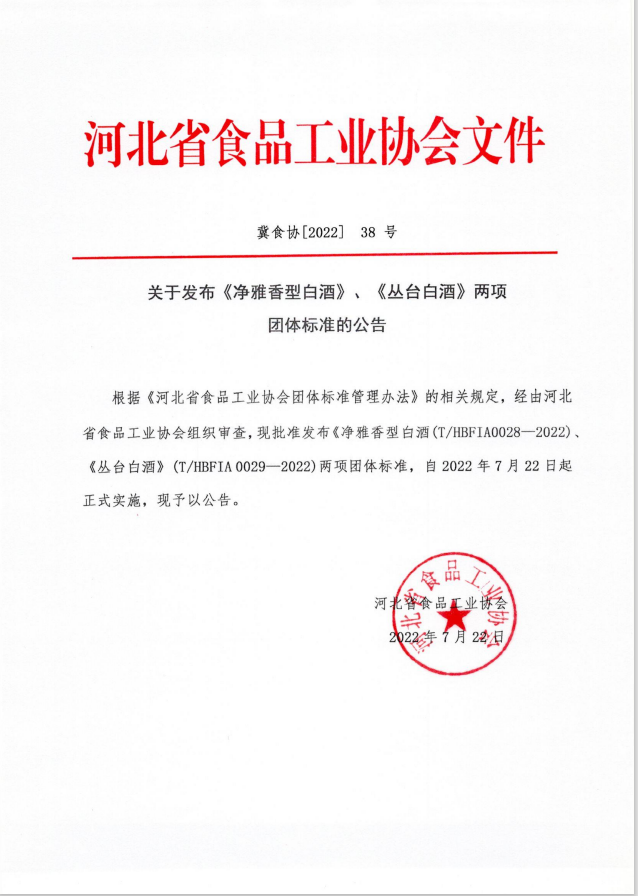 河北省食品工業協會關于發布《凈雅香型白酒》、《叢臺白酒》兩項 團體標準的公告(冀食協[2022]38號)