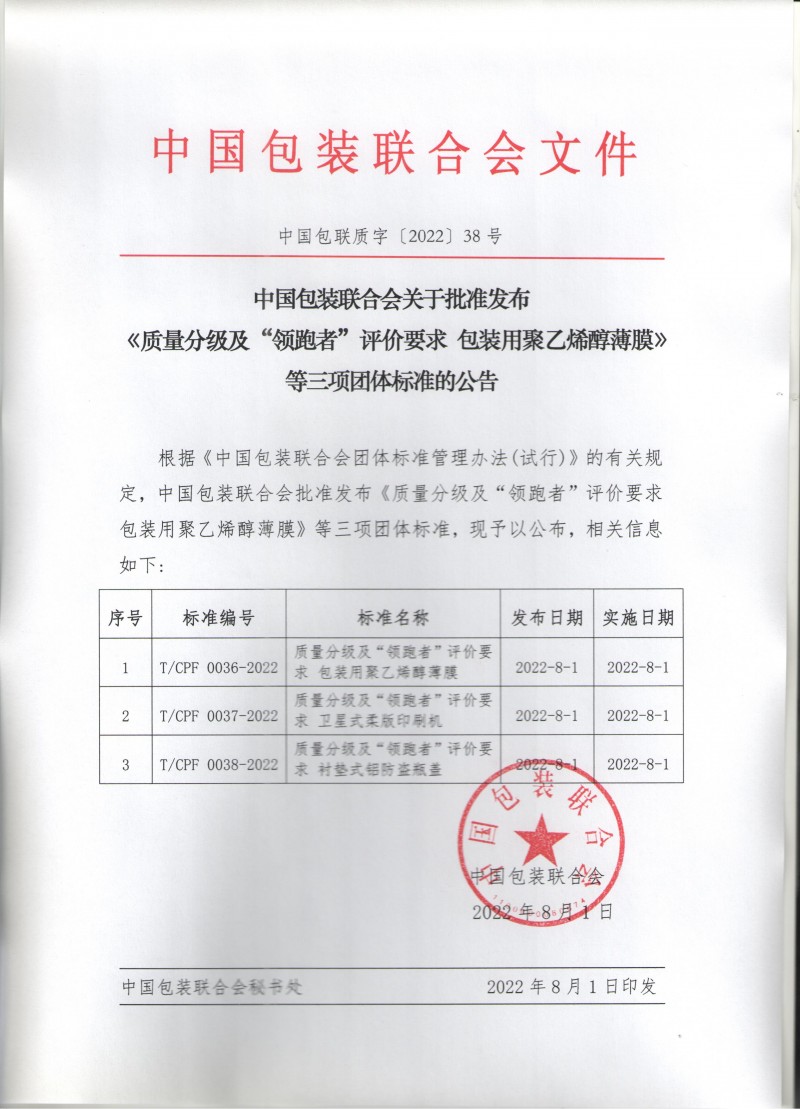 中國包裝聯合會關于批準發布《質量分級及“領跑者”評價要求 包裝用聚乙烯醇薄膜》等三項團體標準的公告(中國包聯質字[2022]38號)