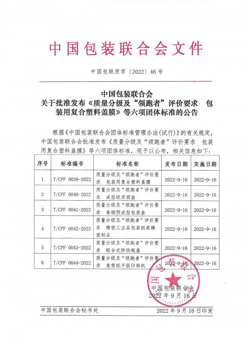 1 | T/CPF 0039-2022 | 質量分級及“領跑者”評價要求 包裝用復合塑料蓋膜 | 2022-09-16 | 2022-09-16 |