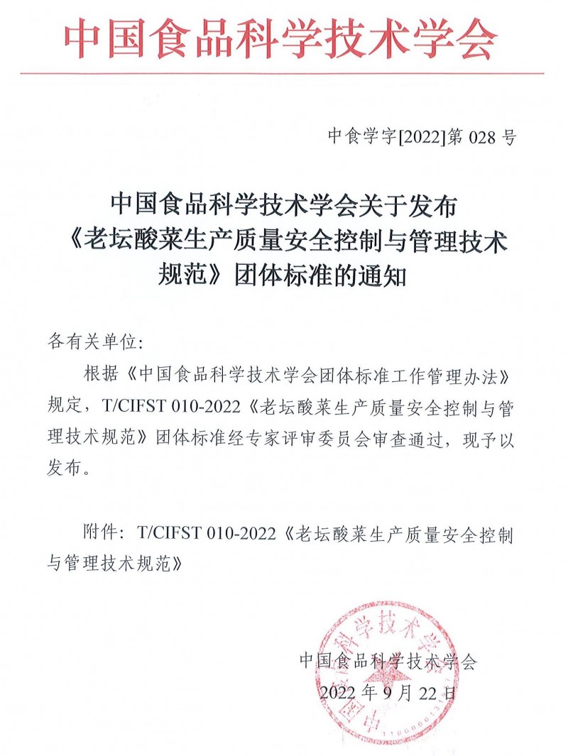 中國食品科學技術學會 關于發布T/CIFST 010-2022《老壇酸菜生產質量安全控制與管理技術規范》團體標準的通知(中食學字[2022]第028號)