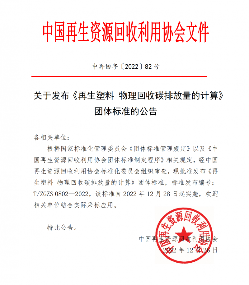 中國再生資源回收利用協會關于發布《再生塑料物理回收碳排放量的計算》團體標準的公告(中再協字〔2022〕82號)