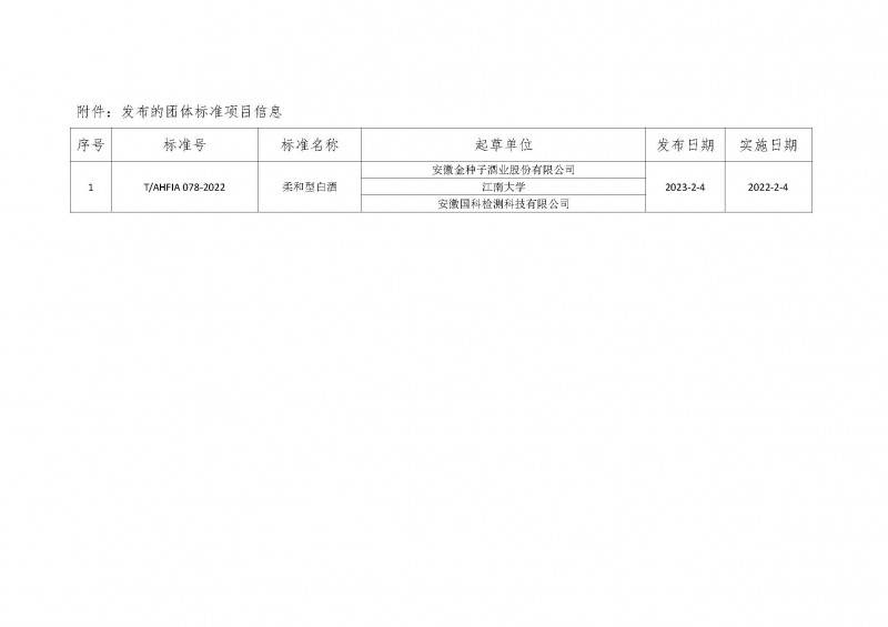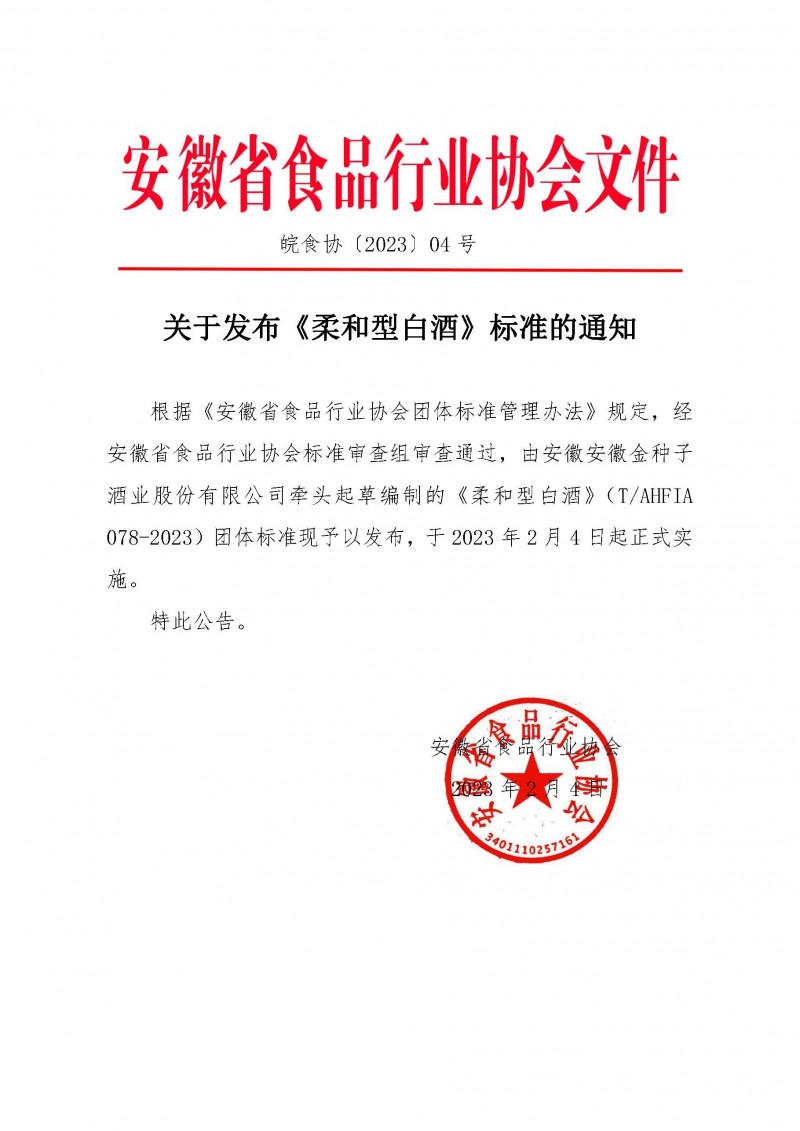 安徽省食品行業協會關于發布《柔和型白酒》標準的通知(皖食協[2023]04號)