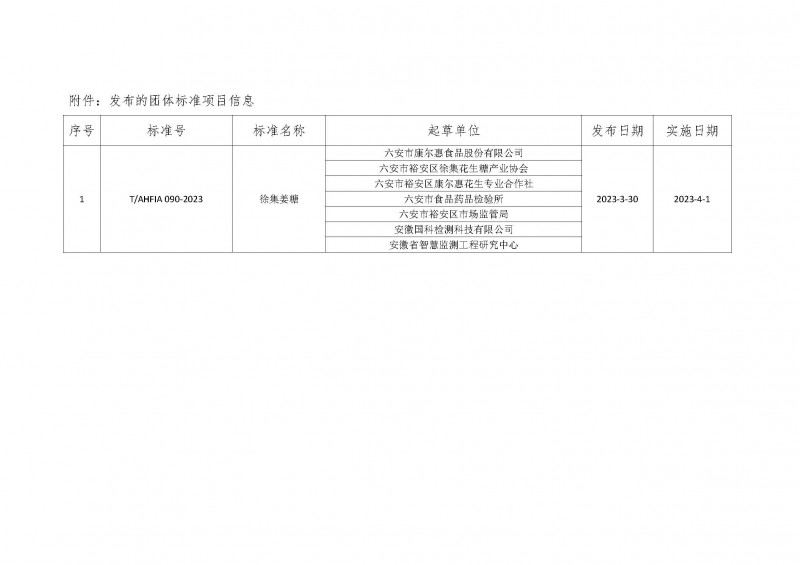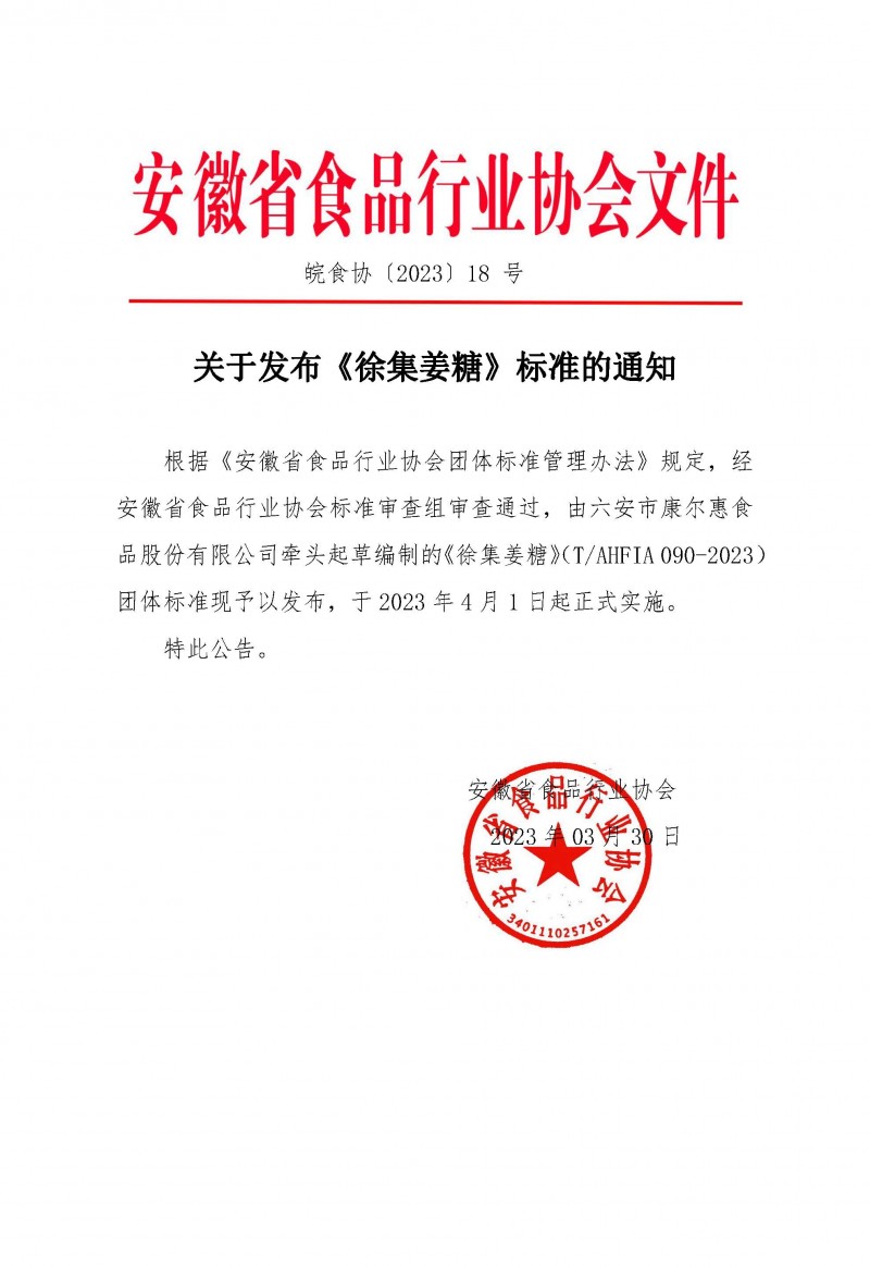 安徽省食品行業協會關于發布《徐集姜糖》標準的通知(皖食協[2023]18號)