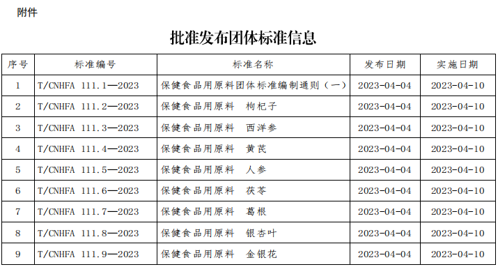 中國營養保健食品協會批準發布《保健食品用原料團體標準編制通則(一)》(T/CNHFA 111.1-2023)等20項團體標準,現予公告,自2023年4月10日起實施。