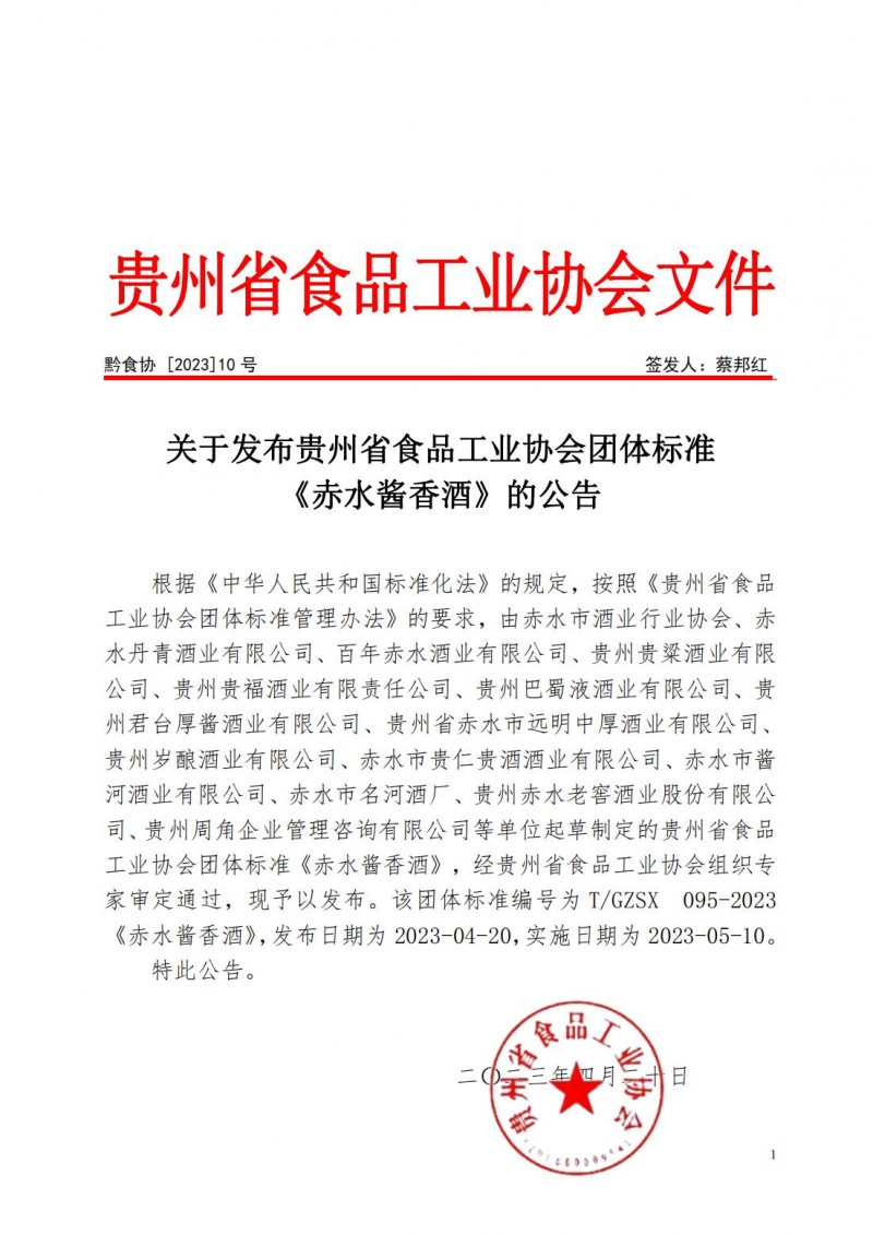 核心提示:經貴州省食品工業協會組織專家審定通過,現予以發布。該團體標準編號為T/GZSX 095-2023《赤水醬香酒》,發布日期為2023-04-20,實施日期為2023-05-10。