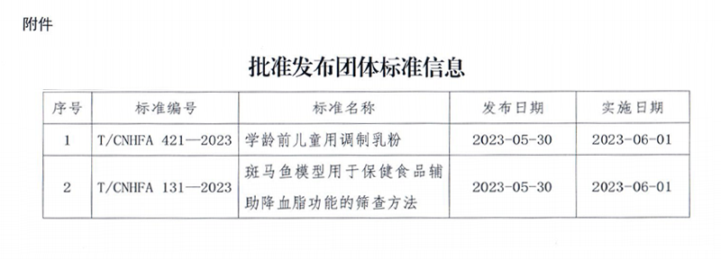 中國營養保健食品協會批準發布《學齡前兒童用調制乳粉》(T/CNHFA 421-2023)、《斑馬魚模型用于保健食品輔助降血脂功能的篩查方法》(T/CNHFA 131-2023)2項團體標準,現予公告,自2023年6月1日起實施。