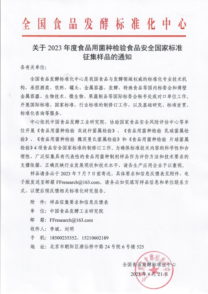 全國食品發酵標準化中心關于2023年度食品用菌種檢驗食品安全國家標準征集樣品的通知
