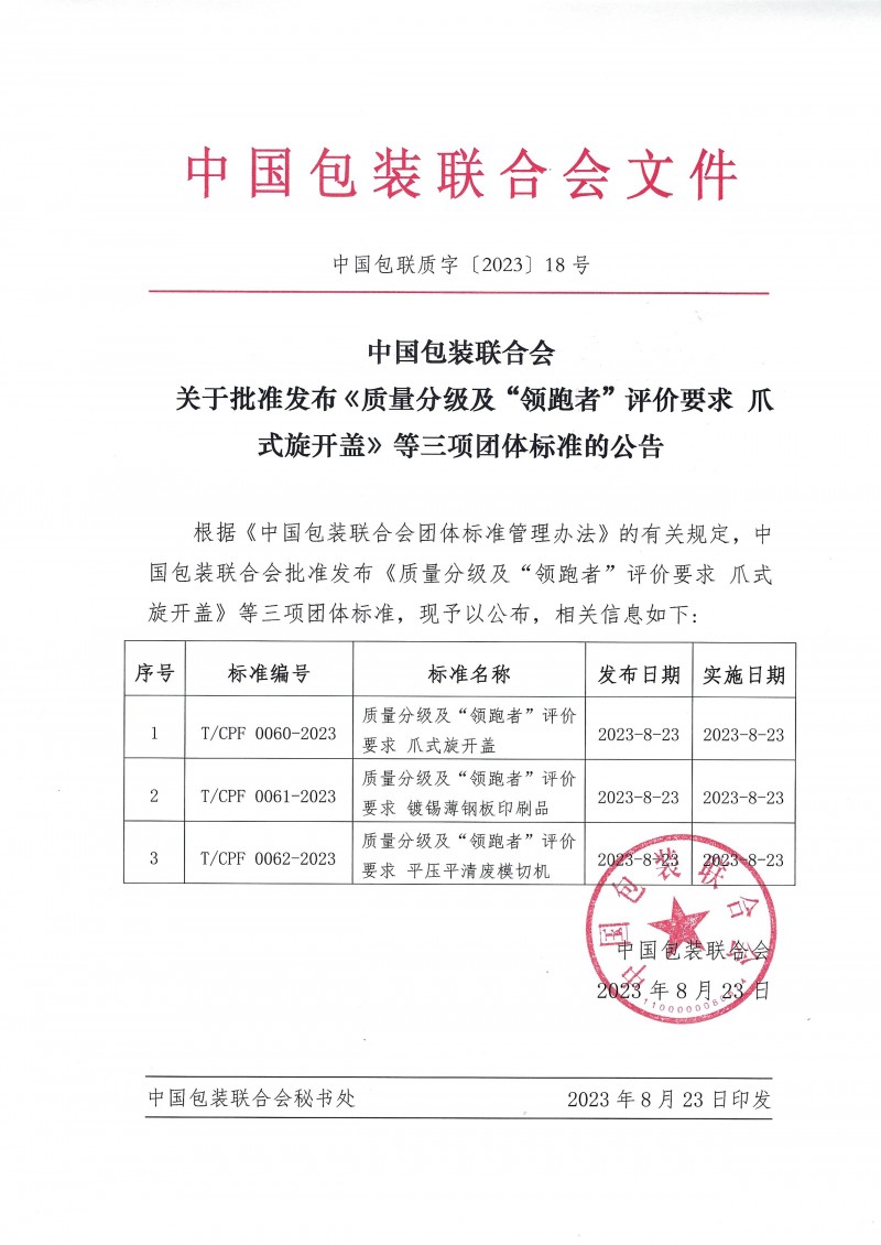 中國包裝聯合會關于批準發布《質量分級及“領跑者”評價要求 爪式旋開蓋》等三項團體標準的公告(中國包聯質字[2023]18號)