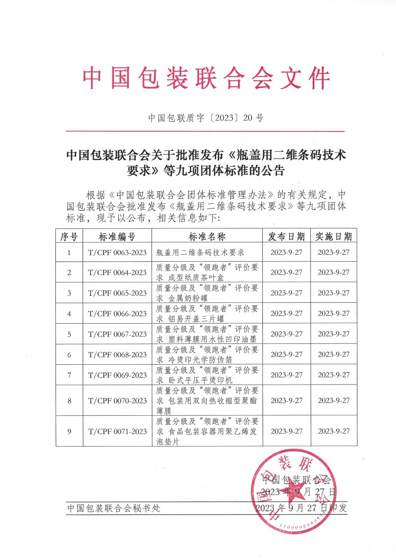 T/CPF 0063-2023 | 瓶蓋用二維條碼技術要求 | 2023-09-27 | 2023-09-27 |