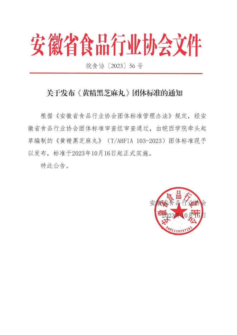 安徽省食品行業協會關于發布《黃精黑芝麻丸》團體標準的通知(皖食協[2023]56號)